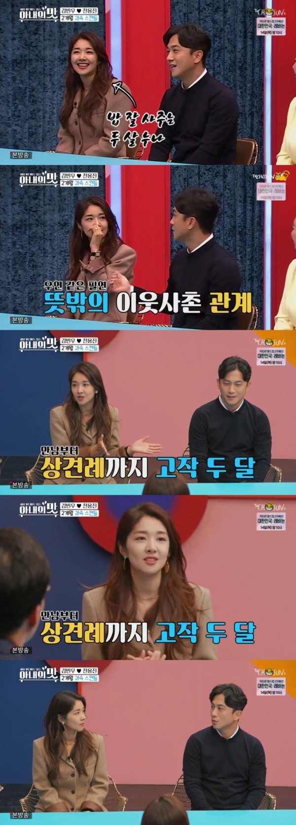 이날 김빈우와 전용진 부부는 처음으로 만나게 된 이유를 묻자 “원래 알고 지나던 누나, 동생 사이였다. (남편이) 두 살 연하다. 근데 우연하게 같은 아파트로 이사를 왔다. 정말 몰랐는데, 지나가다가 만났다. 그러다가 결혼까지”라고 회상했다.