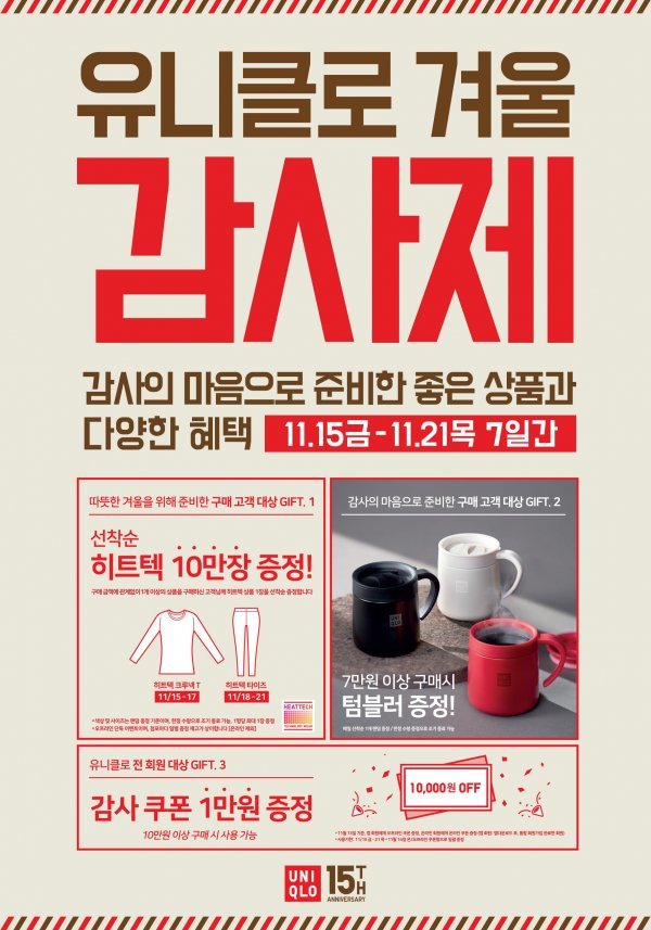 유니클로가 15일부터 21일까지 한국 진출 15주년을 기념해 ‘겨울 감사제’(사진)를 진행한다.