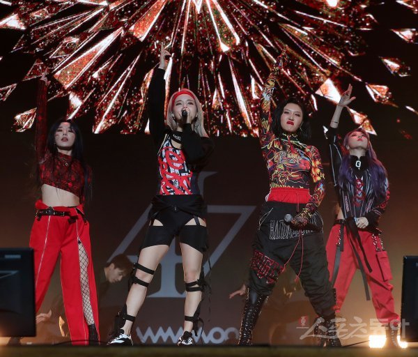 그룹 마마무가 14일 서울 동대문구 회기동 경희대학교 평화의 전당에서 열린 두 번째 정규앨범 ‘reality in BLACK’ 발매 기념 쇼케이스에서 열정적인 무대를 펼치고 있다.
