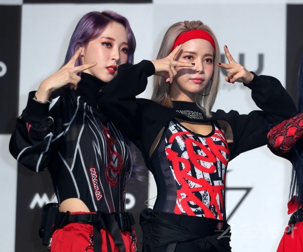그룹 마마무의 문별과 솔라(오른쪽)가 14일 서울 동대문구 회기동 경희대학교 평화의 전당에서 열린 두 번째 정규앨범 ‘reality in BLACK’ 발매 기념 쇼케이스에서 포토타임을 갖고 있다.