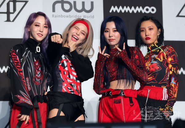 그룹 마마무가 14일 서울 동대문구 회기동 경희대학교 평화의 전당에서 열린 두 번째 정규앨범 ‘reality in BLACK’ 발매 기념 쇼케이스에서 포토타임을 갖고 있다.