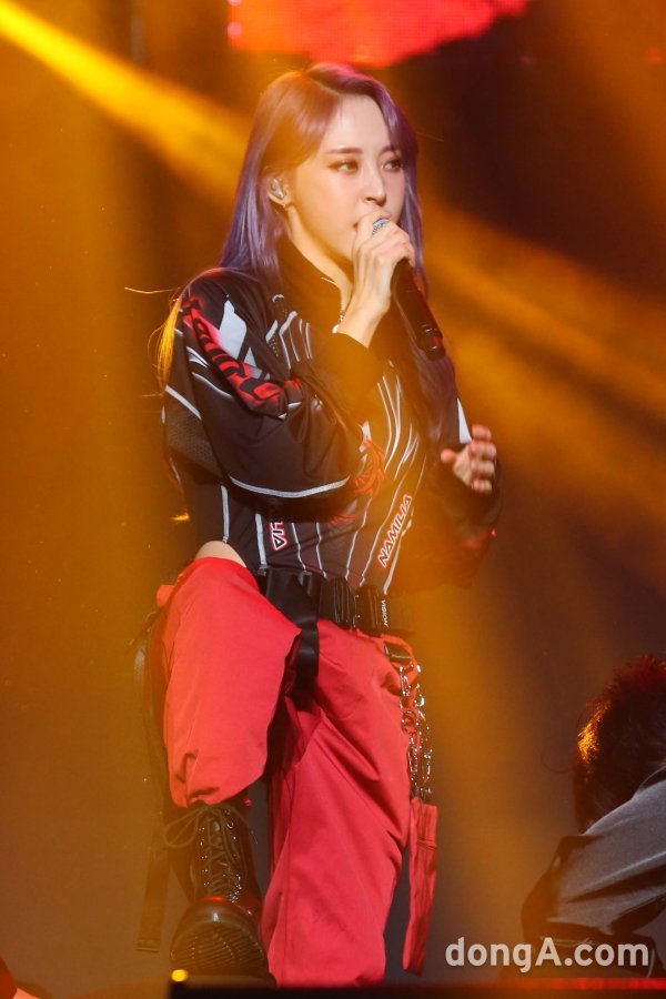 그룹 마마무의 문별이 14일 오후 서울 동대문구 경희대학교 평화의전당에서 열린 새 정규 앨범 \'reality in BLACK\' 발매 쇼케이스에서 새로운 무대를 선보이고 있다.