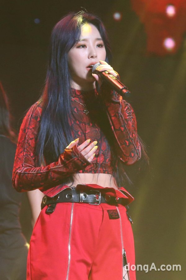 그룹 마마무의 휘인이 14일 오후 서울 동대문구 경희대학교 평화의전당에서 열린 새 정규 앨범 \'reality in BLACK\' 발매 쇼케이스에서 새로운 무대를 선보이고 있다.
