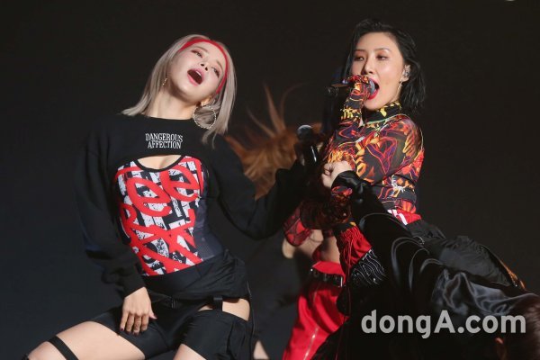 그룹 마마무의 솔라(왼쪽)와 화사가 14일 오후 서울 동대문구 경희대학교 평화의전당에서 열린 새 정규 앨범 \'reality in BLACK\' 발매 쇼케이스에서 새로운 무대를 선보이고 있다.