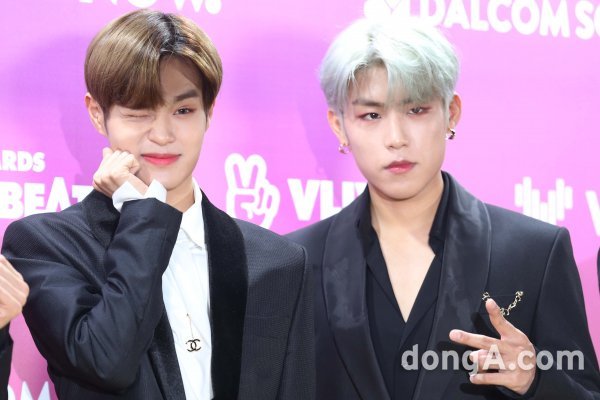 그룹 에이비식스의 이대휘(왼쪽)와 박우진이16일 오후 서울 구로구 고척스카이돔에서 열린 제1회 브이라이브 어워즈 V하트비트 골드카펫행사에 참석하고 있다.