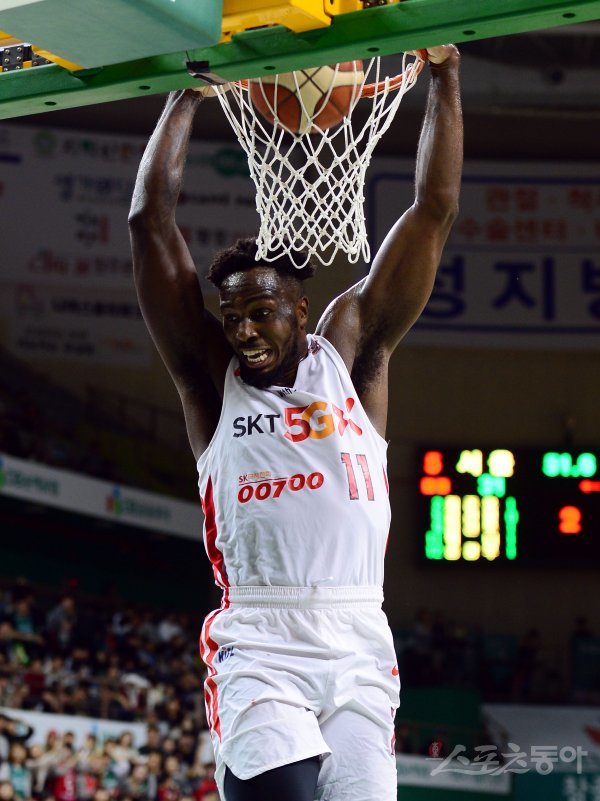17일 강원도 원주 치악체육관에서 열린 ‘2019-2020 현대모비스 프로농구’ 원주 DB와 서울 SK의 경기에서 SK 워니가 덩크슛을 성공하고 있다.