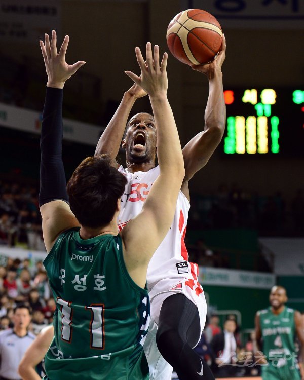 17일 강원도 원주 치악체육관에서 열린 ‘2019-2020 현대모비스 프로농구’ 원주 DB와 서울 SK의 경기에서 SK 헤인즈가 DB 유성호의 수비를 앞에 두고 슛을 쏘고 있다.
