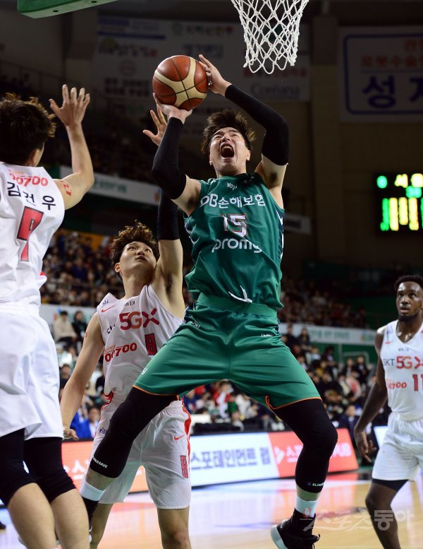 17일 강원도 원주 치악체육관에서 열린 ‘2019-2020 현대모비스 프로농구’ 원주 DB와 서울 SK의 경기에서 DB 김종규가 SK의 수비를 피해 슛을 쏘고 있다.