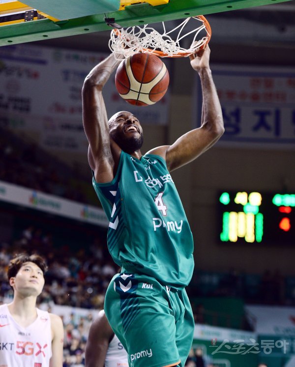17일 강원도 원주 치악체육관에서 열린 ‘2019-2020 현대모비스 프로농구’ 원주 DB와 서울 SK의 경기에서 DB 그린이 덩크슛을 성공하고 있다.