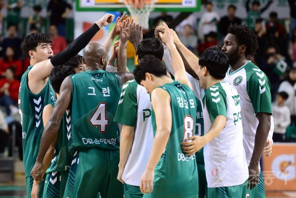 17일 강원도 원주 치악체육관에서 열린 ‘2019-2020 현대모비스 프로농구’ 원주 DB와 서울 SK의 경기에서 DB가 SK에 83-77로 승리한 뒤 선수들이 코트에서 기쁨을 나누고 있다.