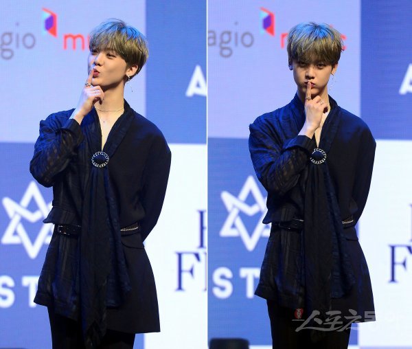 20일 서울 광진구 YES24라이브홀에서 열린 아스트로(ASTRO)의 여섯 번째 미니앨범 ‘블루 플레임(BLUE FLAME)‘ 발매기념 쇼케이스에 참석한 윤산하가 카메라를 향해 포즈를 취하고 있다.
