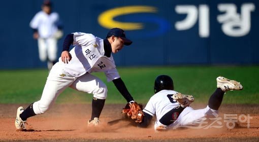 기장군이 주최하고 (주)오투에스앤엠과 부산광역시야구소프트볼협회, 스포츠동아가 주관하는 ‘2019 기장 국제야구 대축제‘가 20일 부산시 기장군 기장현대차드림볼파크에서 열렸다. 고등부 대구고와 마산고 경기 8회초 무사 1루 상황에서 대구고 1루주자 강범이 2루 도루에 성공하고 있다. 기장|김종원 기자 won@donga.com