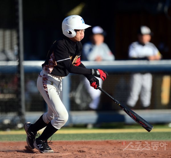 초등부 도산초와 서원초 경기 4회초 2사 만루 도산초 이성준이 동점을 만드는 2타점 적시타를 치고 있다.
