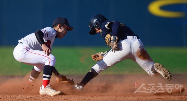 중등부 수원북중과 대천중 경기 4회초 2사 1루 상황에서 수원북중 1루주자 임준우가 2루 도루에 성공하고 있다.
