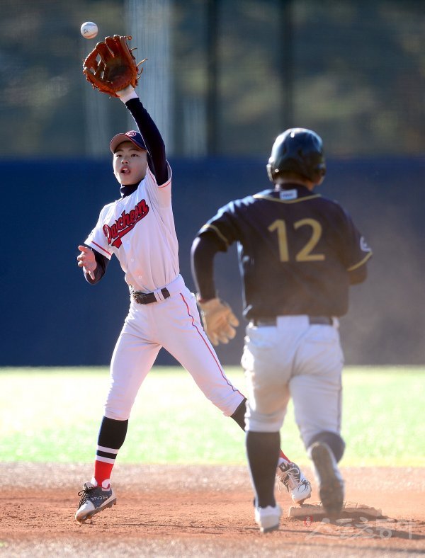 중등부 수원북중과 대천중 경기 3회초 1사 1루 수원북중 내야 땅볼 때 대천중 하재민이 1루주자를 포스 아웃시키고 있다.