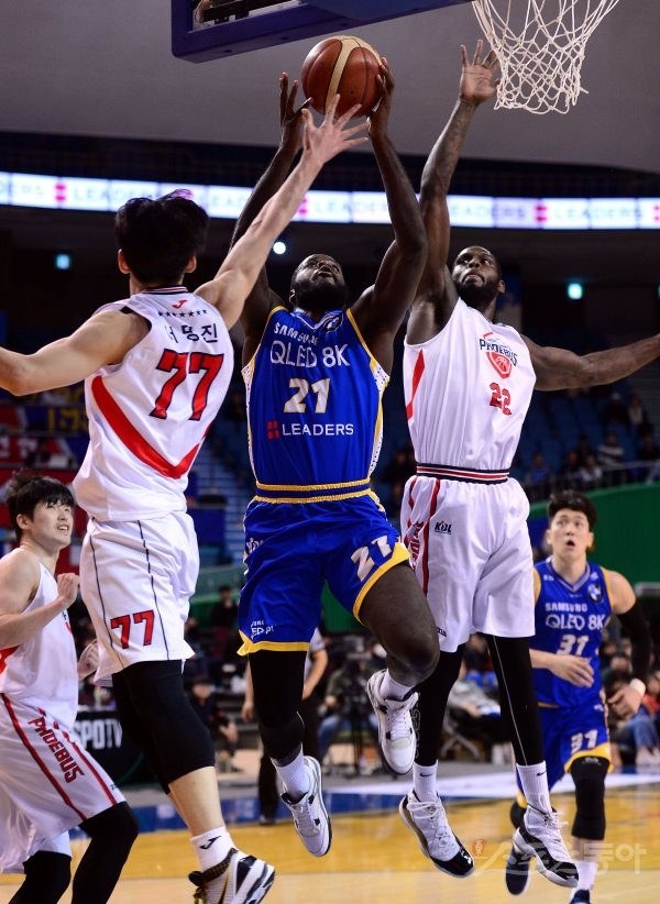 20일 서울 잠실실내체육관에서 열린 ‘2019-2020 현대모비스 프로농구’ 서울 삼성과 울산 모비스의 경기에서 삼성 제임스가 모비스 차명진, 윌리엄스의 수비를 피해 슛을 쏘고 있다.