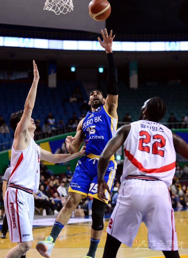 20일 서울 잠실실내체육관에서 열린 ‘2019-2020 현대모비스 프로농구’ 서울 삼성과 울산 모비스의 경기에서 삼성 문태영이 모비스 수비를 피해 슛을 쏘고 있다.