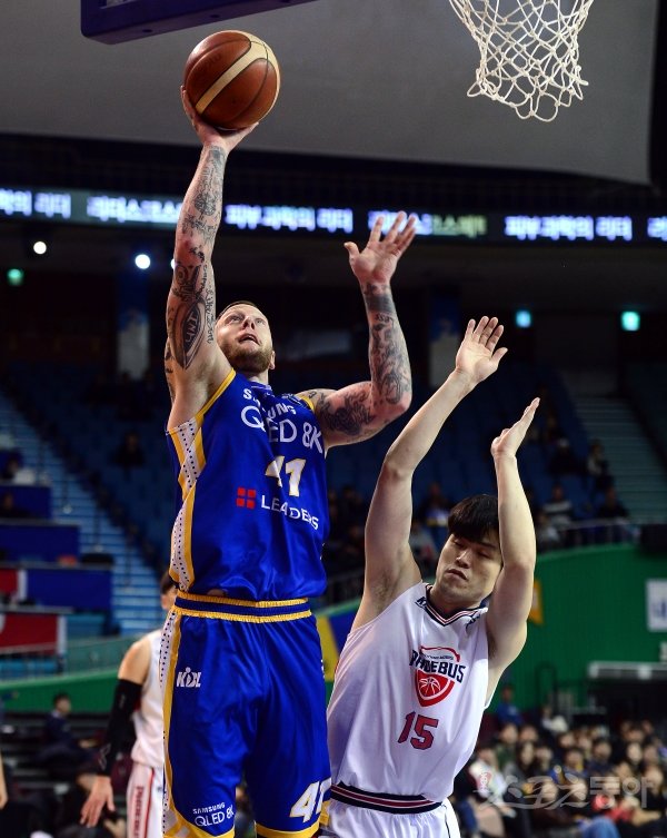 20일 서울 잠실실내체육관에서 열린 ‘2019-2020 현대모비스 프로농구’ 서울 삼성과 울산 모비스의 경기에서 삼성 미네라스가 모비스 박지훈의 수비를 피해 슛을 쏘고 있다.