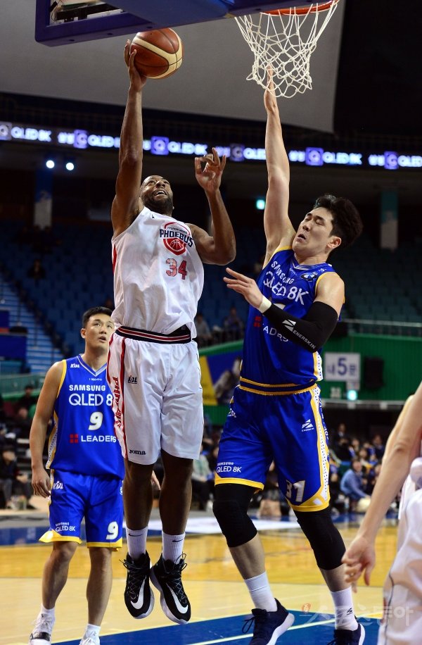 20일 서울 잠실실내체육관에서 열린 ‘2019-2020 현대모비스 프로농구’ 서울 삼성과 울산 모비스의 경기에서 모비스 윌리엄스가 삼성 김준일의 수비를 피해 슛을 쏘고 있다.