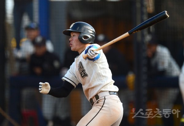 기장군이 주최하고 (주)오투에스앤엠과 부산광역시야구소프트볼협회, 스포츠동아가 주관하는 ‘2019 기장 국제야구 대축제’가 22일 부산시 기장군 기장현대차드림볼파크에서 열렸다. 고등부 개성고와 포항제철고 경기 9회초 2사 만루 개성고 천지환이 싹쓸이 3타점 중전 2루타를 치고 있다.