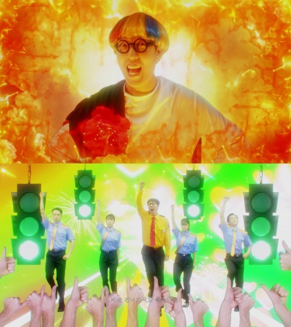 \'신호등\'은 트로트와 일렉트로닉 댄스 음악(EDM)을 결합한 일명 \'뽕DM\'으로 바다가 작사, 작곡에 참여해 힘을 보탰다. 노래 만큼 요란한 뮤직비디오도 감상 포인트. 화려한 CG 연출로 B급 감성의 분위기를 담은 뮤직비디오에는 김영철과 \'서프라이즈 걔\'로 유명한 박재현, 김하영이 출연해 열연을 펼쳤다.