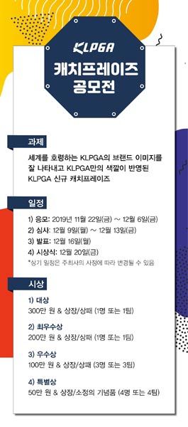 KLPGA 강춘자 수석부회장은 “KLPGA가 팬과의 소통을 위해 처음으로 시행하는 공모전이다. 이번 공모전을 통해 KLPGA과 잘 어울리는 캐치프레이즈가 나오기를 기대한다. 많은 KLPGA 팬분들의 적극적인 참가를 부탁드린다”고 말했다.