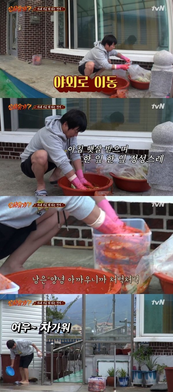 22일 방송된 tvN 예능프로그램 \'신서유기7\'에서는 김장 미션에 성공하기 위해 아침 이른 시간부터 김장에 나선 이수근의 모습이 그려졌다.