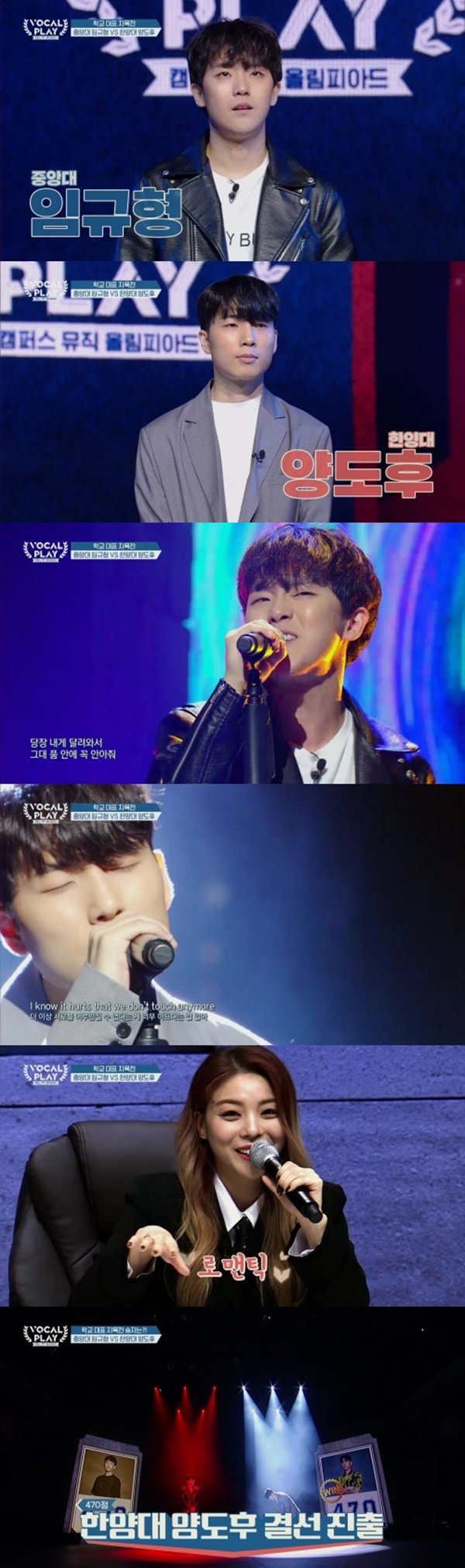 ‘보컬플레이2’의 ‘한양대 로맨틱 가이’ 양도후가 470점이라는 고득점을 받으며 ‘중앙대 감성 발라더’ 임규형을 물리치고 결선 진출을 확정했다.