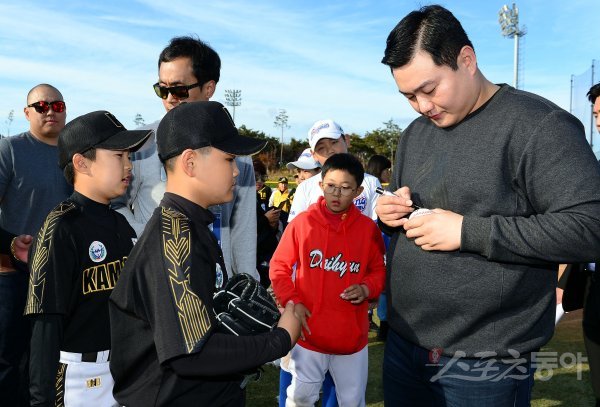 기장군이 주최하고 (주)오투에스앤엠과 부산광역시야구소프트볼협회, 스포츠동아가 주관하는 ‘2019 기장 국제야구 대축제’가 23일 부산시 기장군 기장현대차드림볼파크에서 열렸다. 스킬캠프에 참석한 템파베이 레이스 최지만이 유소년 야구 꿈나무들에게 사인을 하고 있다.