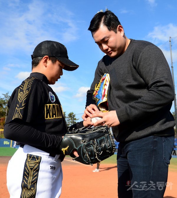기장군이 주최하고 (주)오투에스앤엠과 부산광역시야구소프트볼협회, 스포츠동아가 주관하는 ‘2019 기장 국제야구 대축제’가 23일 부산시 기장군 기장현대차드림볼파크에서 열렸다. 스킬캠프에 참석한 템파베이 레이스 최지만이 유소년 야구 꿈나무들에게 지도하고 있다.
