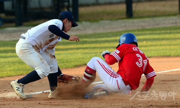 기장군이 주최하고 (주)오투에스앤엠과 부산광역시야구소프트볼협회, 스포츠동아가 주관하는 ‘2019 기장 국제야구 대축제’가 23일 부산시 기장군 기장현대차드림볼파크에서 열렸다. 군산상고와 마산고의 야구경기에서 6회초 2사 1, 2루에서 군산상고 오승훈의 적시타 때 1루 주자 이용일이 3루에서 태그 아웃되고 있다.