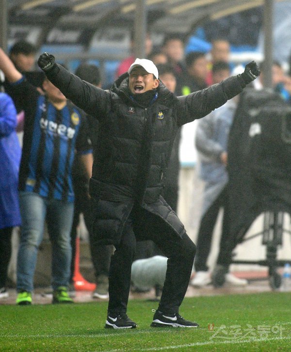 24일 인천축구전용경기장에서 열린 프로축구 ‘하나원큐 K리그1 2019’ 파이널라운드 상주 상무와 인천 유나이티드 경기에서 인천 케힌데가 추가골을 성공시키자 유상철 감독이 환호하고 있다.