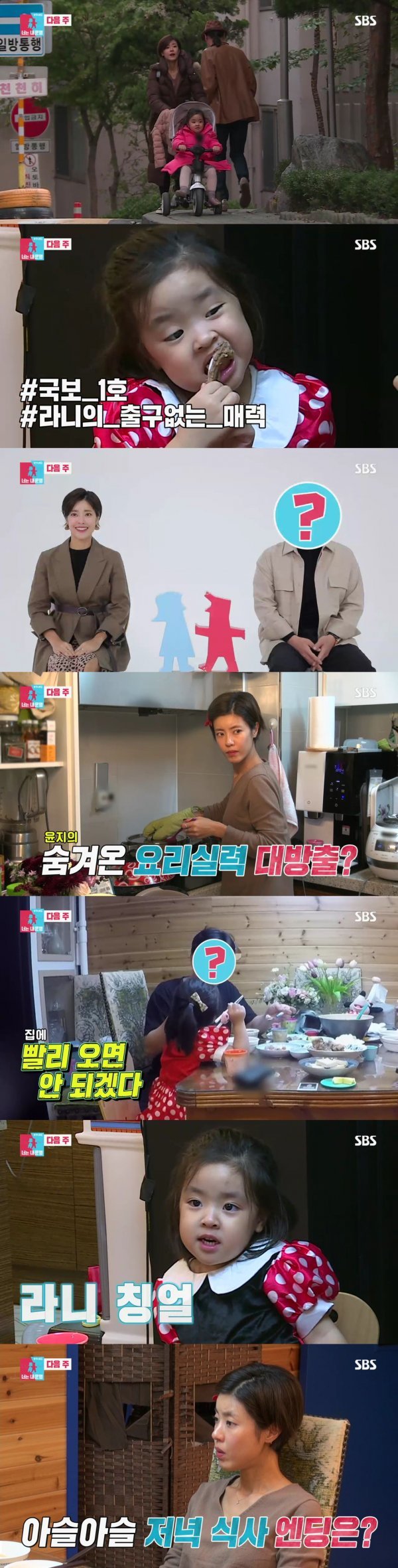 이와 함께 랜선 삼촌, 이모들의 마음을 사로잡을 이윤지의 딸 라니가 등장해 더욱 반가움을 안겼다. 이윤지는 딸 라니에 대해 ‘저의 보물’이라고 소개했고, 라니는 엄마를 도와 채소를 씻고 춤을 추는 등 깜찍 발랄한 모습으로 눈길을 끌었다. 그런가 하면 라니는 갈비찜을 야무지게 먹으며 출구 없는 매력을 뽐냈다. 이에 스튜디오 MC 서장훈과 김구라는 “지금 몇 개째 뜯고 있는 거냐”, “아주 막강하다”라고 덧붙여 웃음을 안겼다.