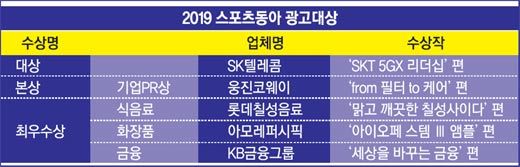 뛰어난 콘텐츠와 디자인, 혁신적인 아이디어로 소비자의 마음을 깊게 울리는 광고 5편이 2019 스포츠동아 광고대상 수상작으로 선정됐다. SK텔레콤의 ‘SKT 5GX 리더십’편이 대상을 차지했고, 웅진코웨이 ‘from 필터 to 케어’편은 본상 기업 PR상을, 롯데칠성음료 ‘맑고 깨끗한 칠성사이다’편, 아모레퍼시픽 ‘아이오페 스템 Ⅲ 앰플’편, KB금융그룹 ‘세상을 바꾸는 금융’편이 각각 최우수상을 받았다. 수상작들은 독창적이고 뛰어난 크리에이티브와 시대 흐름에 맞는 트렌드로 소비자들에게 강렬하고 차별화된 메시지를 전달하고 있다.