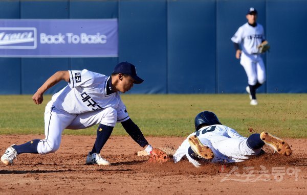 기장군이 주최하고 (주)오투에스앤엠과 부산광역시야구소프트볼협회, 스포츠동아가 주관하는 ‘2019 기장 국제야구 대축제’가 30일 부산시 기장군 기장현대차드림볼파크에서 열렸다. 대구고등학교와 경남고등학교의 고등부 야구 결승 경기에서 4회초 2사 1루에서 경남고 이상혁 타석 때 1루 주자 김동하가 2루 도루에 성공하고 있다.