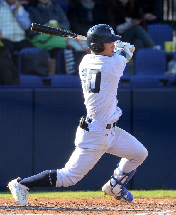 기장군이 주최하고 (주)오투에스앤엠과 부산광역시야구소프트볼협회, 스포츠동아가 주관하는 ‘2019 기장 국제야구 대축제’가 30일 부산시 기장군 기장현대차드림볼파크에서 열렸다. 대구고등학교와 경남고등학교의 고등부 야구 결승 경기에서 4회초 1사 3루에서 경남고 김동하가 1타점 적시타를 날리고 있다.