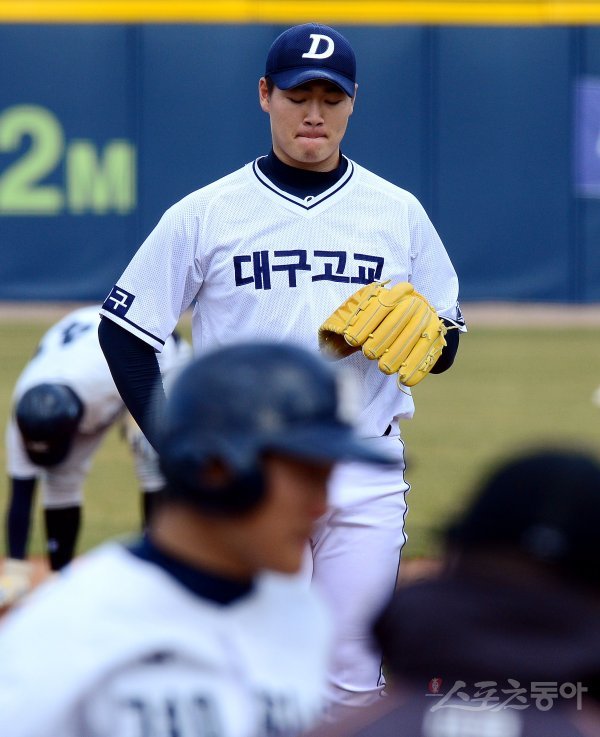 기장군이 주최하고 (주)오투에스앤엠과 부산광역시야구소프트볼협회, 스포츠동아가 주관하는 ‘2019 기장 국제야구 대축제’가 30일 부산시 기장군 기장현대차드림볼파크에서 열렸다. 대구고등학교와 경남고등학교의 고등부 야구 결승 경기에서 대구고 선발 전영준이 볼넷으로 2실점을 허용한 뒤 아쉬워하고 있다.