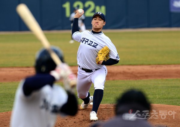 기장군이 주최하고 (주)오투에스앤엠과 부산광역시야구소프트볼협회, 스포츠동아가 주관하는 ‘2019 기장 국제야구 대축제’가 30일 부산시 기장군 기장현대차드림볼파크에서 열렸다. 대구고등학교와 경남고등학교의 고등부 야구 결승 경기에서 대구고 선발투수 전영준이 힘차게 볼을 던지고 있다.