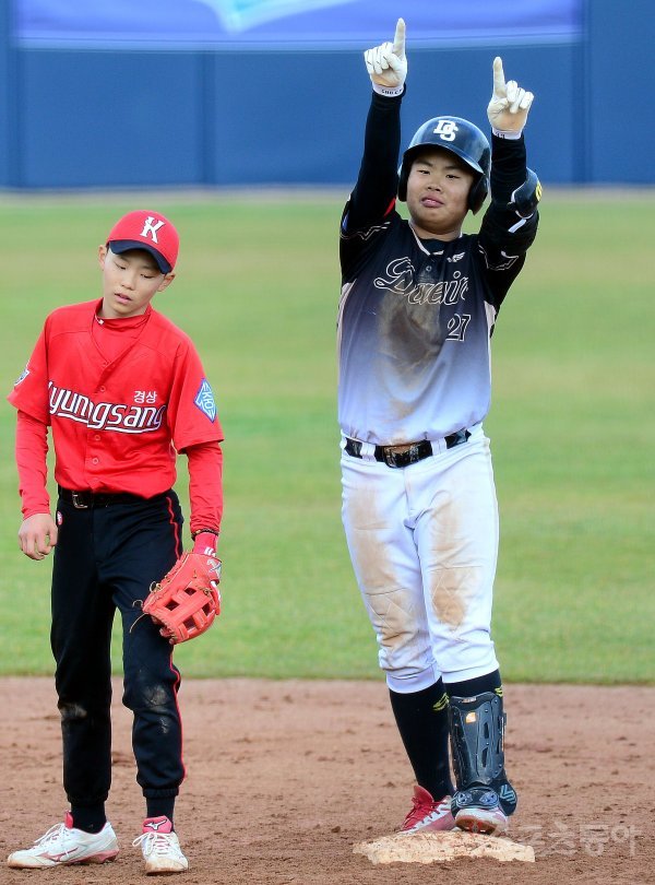 기장군이 주최하고 (주)오투에스앤엠과 부산광역시야구소프트볼협회, 스포츠동아가 주관하는 ‘2019 기장 국제야구 대축제’가 30일 부산시 기장군 기장현대차드림볼파크에서 열렸다. 대구 경상중학교와 부산 대신중학교의 중학부 야구 결승경기에서 연장 8회초 무사 만루에서 대신중 고영웅이 2타점 적시타를 날린 뒤 2루까지 진루해 환호하고 있다.