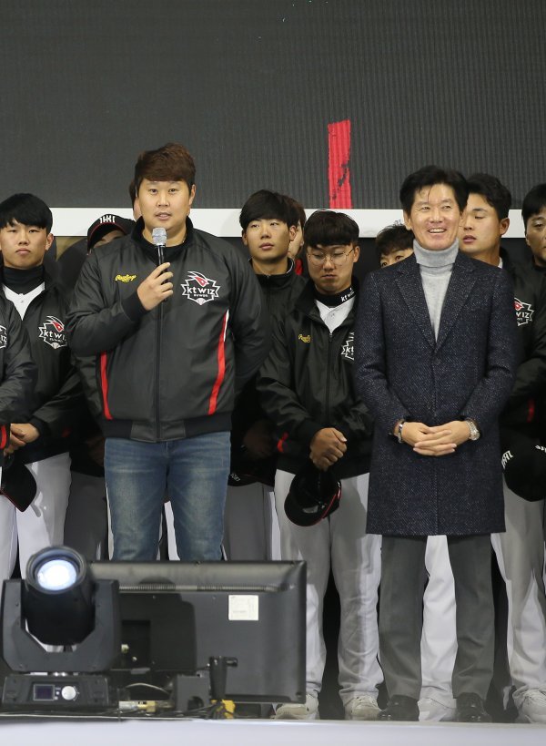 ‘캡틴’ 유한준 역시 “내년에는 꼭 가을야구 하겠다”는 짧은 각오로 사령탑의 방향에 동의했다. 2차드래프트로 KT에 합류해 첫 공식행사에 나선 이보근의 각오는 조금 더 패기가 넘쳤다. 그는 “팬 페스티벌은 처음이라 떨린다”고 운을 뗀 뒤 “2019년 KT는 아쉽게 가을야구에 가지 못했다. 내년에는 팀에 더 보탬이 되겠다. 팬들이 두꺼운 점퍼 입고 위즈파크에 오시도록 하겠다”고 말해 팬들의 함성을 자아냈다. 뒤에서 이를 들은 이 감독도 파안대소하며 이보근을 반겼다.