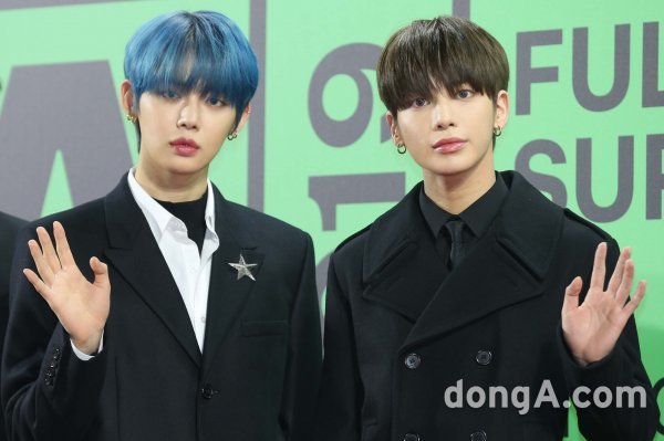 그룹 투모로우바이투게더(TXT)의 연준(왼쪽)과 태현이 30일 서울 고척스카이돔에서 열린 대중음악 시상식 \'MMA 2019(멜론뮤직어워드)\' 행사에 참석하고 있다.