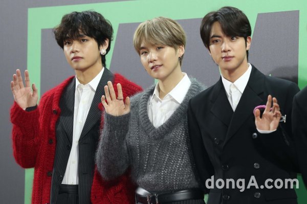 그룹 방탄소년단의 뷔, 슈가, 진(왼쪽부터)이 30일 서울 고척스카이돔에서 열린 대중음악 시상식 \'MMA 2019(멜론뮤직어워드)\' 행사에 참석하고 있다.
