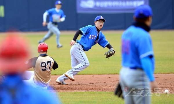 기장군이 주최하고 (주)오투에스앤엠과 부산광역시야구소프트볼협회, 스포츠동아가 주관하는 ‘2019 기장 국제야구 대축제’가 1일 부산시 기장군 기장현대차드림볼파크에서 열렸다. 어택라인과 부산돌격의 사회인 3부리그 결승경기에서 1회말 무사 1루에서 부산돌격 김석주 타석 때 1루 주자 한효준이 2루 도루에 성공하고 있다.
