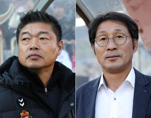경남FC 감독 김종부(왼쪽)-부산 감독 조덕제. 사진제공|한국프로축구연맹
