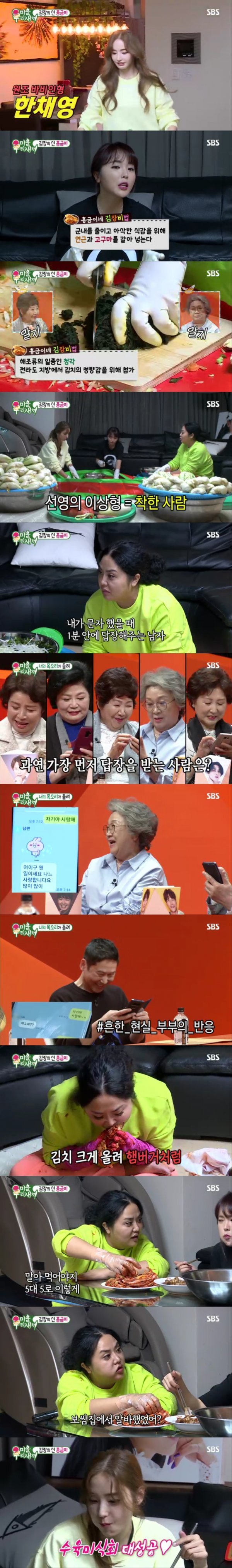 또 이날 한채영은 온갖 재료를 넣고 직접 수육을 삶는 요리 솜씨를 뽐내며 ‘수육미식회’를 선보였다. 홍선영은 김치에 밥과 수육 고기를 5대 5로 말아서 먹는 ‘수육 먹방’으로 군침을 자극했다. 홍선영은 한채영에게 “냄새가 하나도 안난다, 맛있다”며 “보쌈집에서 아르바이트했냐”며 감탄했다.