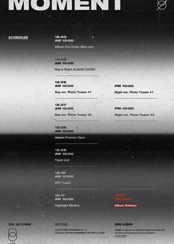 김재환은 2일 오전 공식 SNS 계정을 통해 두 번째 미니앨범 ‘모먼트(MOMENT)’ 프로모션 일정이 담긴 스케줄러 이미지를 공개했다.
