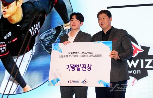 2일 서울 강남 임피리얼 팰리스 호텔에서 프로야구선수협회가 주최하는 ‘2019 플레이어스 초이스 어워드’가 열렸다. 기량발전상을 수상한 kt 배제성이 이대호 선수협회장과 기념촬영을 하고 있다.