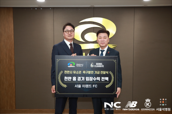 프로축구 K리그2 서울 이랜드 FC가 천안에서 개최했던 홈경기 10경기 입장수입 전액을 천안시 유소년 축구 발전을 위한 기금으로 전달했다.
