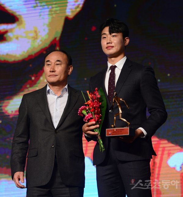 K리그1 영플레이어상을 수상한 강원GC 김지현이 기념촬영을 하고 있다.
