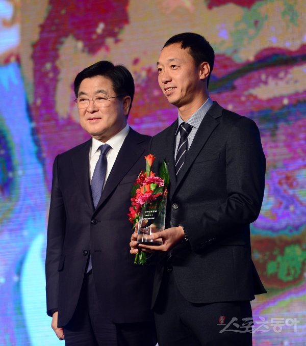 K리그2 감독상을 수상한 광주FC 박진섭 감독이 기념촬영을 하고 있다.
